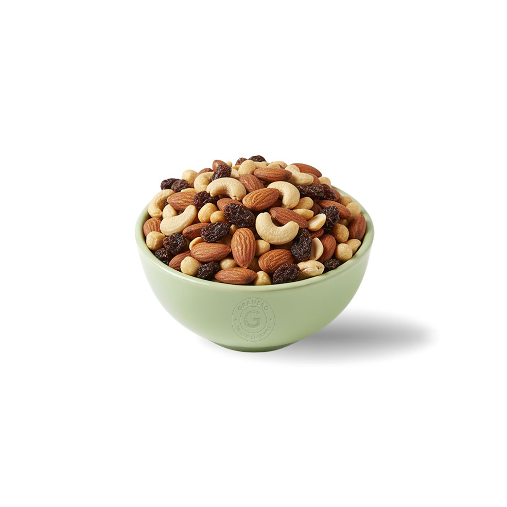 El mix de frutos secos Europeo incluye almendras enteras, castañas de cajú enteras, maní repelado tostado sin sal, pasas de uvas rubias y pasas morenas sin semillas